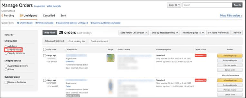 We recommend using the filters on the left side of the Manage orders page to prioritize orders which need to be shipped first. Use the “Ship by today” filter as highlighted in the image below to filter orders with today’s Estimated Ship Date (ESD).